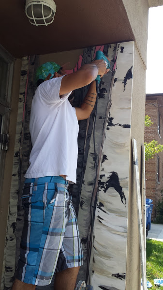 The mural, titled Birches at Sunset, was painted on panels this past summer and is being installed at Magnattude Hair Salon this week. The mural was designed and led by artist and Tara Dorey, assisted by Emlily Harrison and five youth employed at Mural Routes for the summer season. The youth team were mentored throughout the summer to brainstorm the design, cut and sand panels, prime, and paint under the direction of lead artists. This mural was made possible by the City of Toronto Economic Development grant.