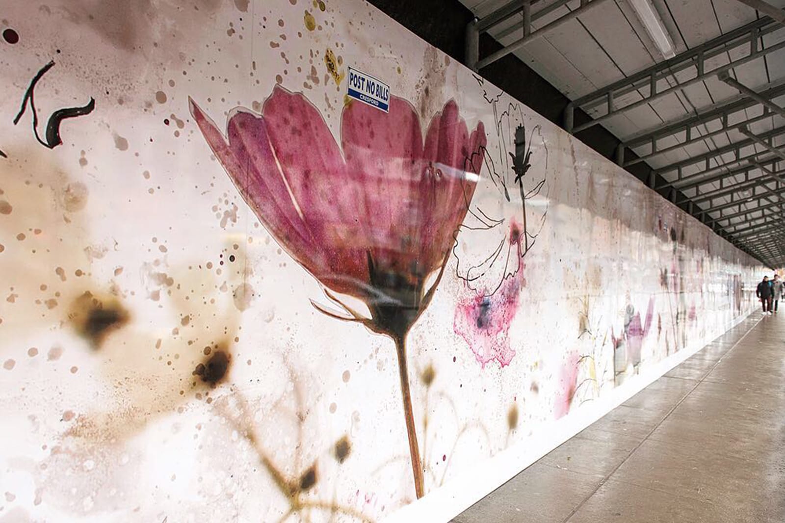 MR Circle: Pam Lostracco150-feet of Cosmos flowers are brightening up Yonge Street, wallpapering the construction hoarding in front of Cresford’s Clover Development. The spring garden brings nature to an otherwise concrete area of downtown Toronto. This artwork was created using mixed media—a layering of photo transfers, pencil drawings and watercolours. The final piece was enlarged, then printed on vinyl and installed onto the hoarding. At this enormous size, you can see all the fine textures and walk among the flowers and the bees. Created with The PATCH Project.
