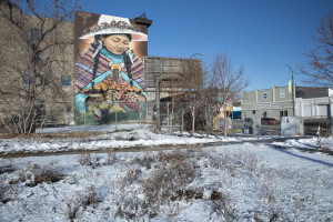 Completed: 2016Winner of Mural of the Year 2016, this mural depicts a woman mending a ripped heart with thread. It represents the unity of First Nations peoples, from the South to the North. The muskox on her hat relate to how these animals protect their young from predators. The vamps on her poncho are symbols for the missing and murdered Indigenous women in Canada, and it highlights the severity of this issue in this particular area of Winnipeg. The act of heart mending occurs every day, in various ways whether it be physical or spiritual, we are all on a process of healing.